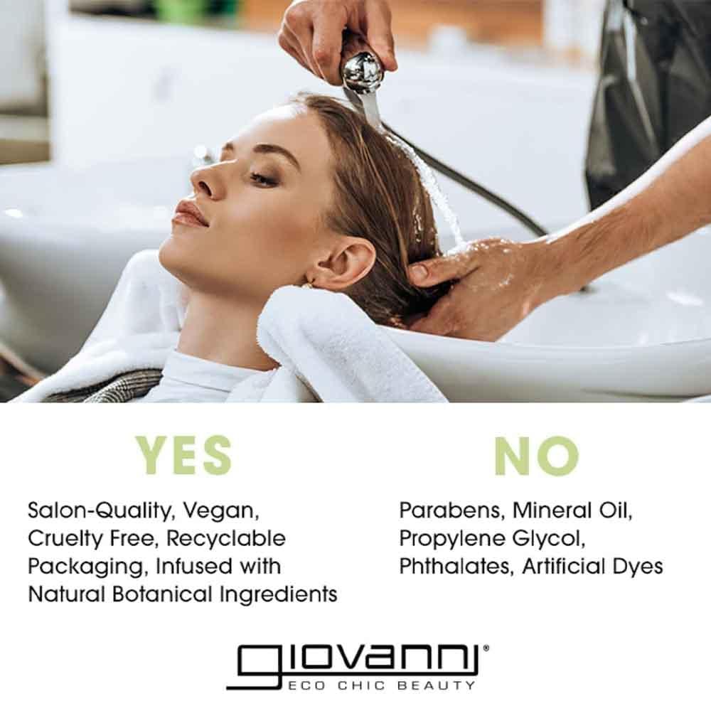 غسول آمن على اللون: إكسير الشعر والجسم فائق النعومة من جيوفاني آمن 100% على اللون، ينظف ويغذي الشعر بالفيتامينات ومضادات الأكسدة دون إزالة اللون.